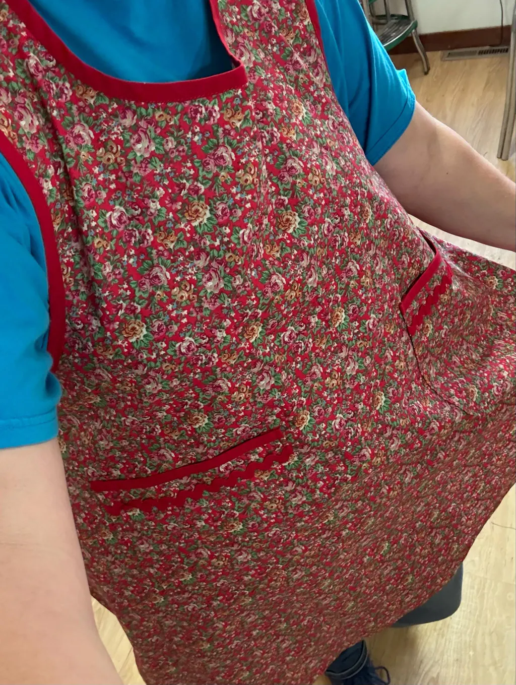 This is an old fashioned Grandma style full apron with small red, blue, pink and green flowers on a red background. The colors of Christmas but you can easily wear it all year long. It's edged in a red bias with red rick rack and bias on the pocket which was the style during the 1940's. What a nostalgic look.